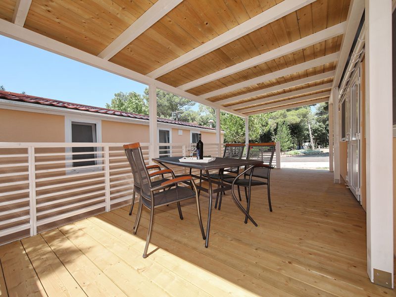 1/4+2 MH GLAMPING DE LUX: 32 m2, za 6 osoba. Dnevni boravak s kutnom garniturom s mogućnošću otvaranja i ima bračni krevet (135x190cm), stol i 3 stolice, opremljenu kuhinju, hladnjak, štednjak, SAT TV, klima uređaj, besplatni WiFi. Glavna soba s bračnim krevetom (160×200 cm) i kupaonicom, spavaća soba s dva odvojena kreveta (80×200 cm) s kupaonicom. Natkrivena i opremljena terasa sa vrtnom garniturom, stolom i stolicama sa nadstrešnicom od 24m2, udaljenost od mora 300-400m.