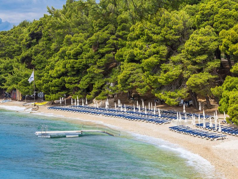 Plaža: šljunčana plaža uz morsku šetnicu ispred resorta; plaža Zlatni rat udaljena je ugodnom šetnjom uz more; ležaljke i suncobrani na plaži dostupni uz doplatu kod vanjskih pružatelja usluga.