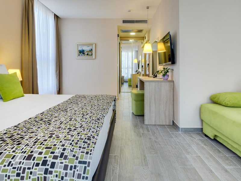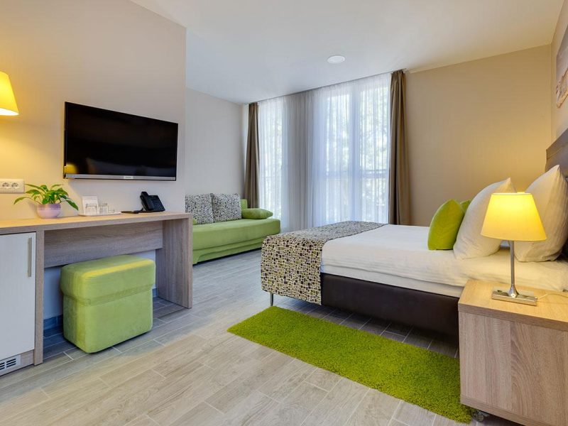 Premium obiteljska soba balkon (27-29 m²) – pomoćni ležaj kauč (160×200) , kada/WC, sušilo za kosu, telefon, aparat za kavu, sef, LCD Sat TV, klima uređaj, hladnjak / mini bar (na upit uz doplatu), balkon.