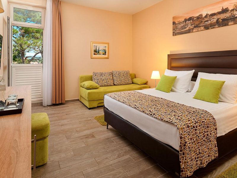 Premium obiteljska soba balkon pogled more (27-29 m²) – pomoćni ležaj kauč (160×200) , tuš kada/WC, sušilo za kosu, telefon, aparat za kavu, sef, LCD Sat TV, klima uređaj, hladnjak / mini bar (na upit uz doplatu), balkon pogled more.