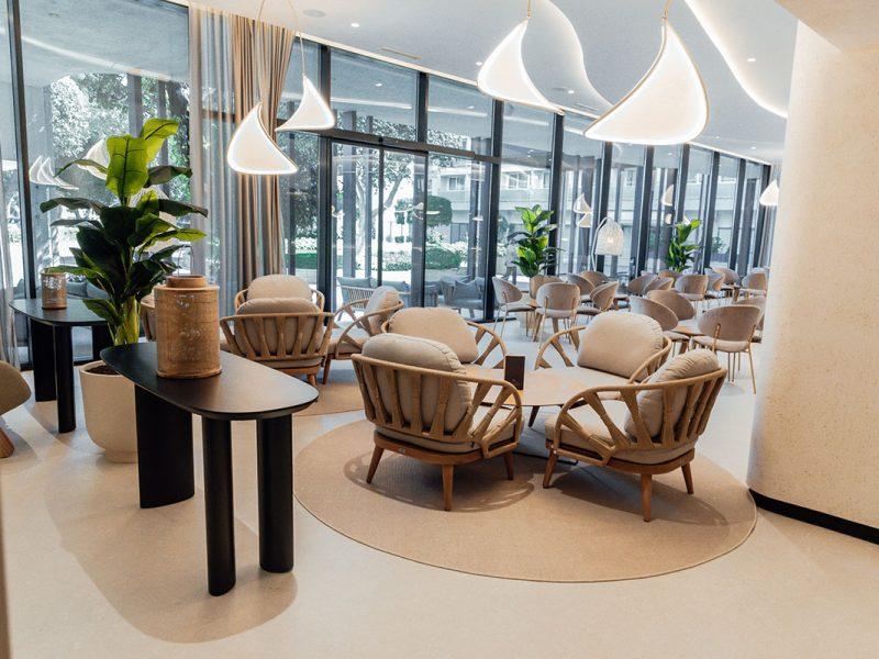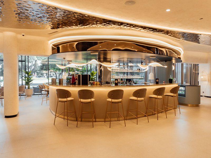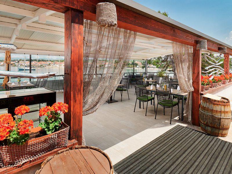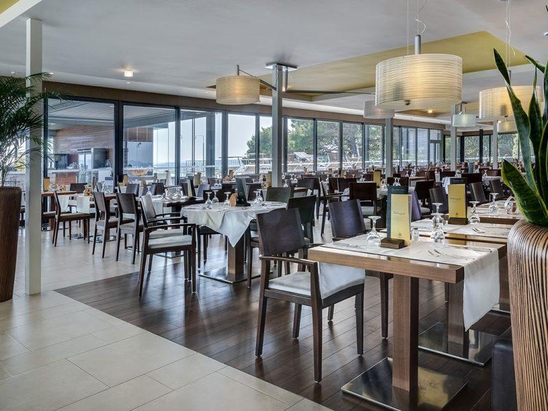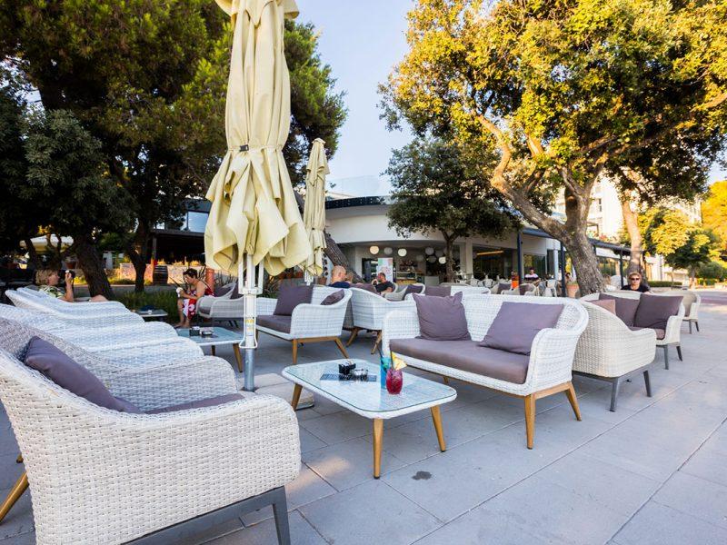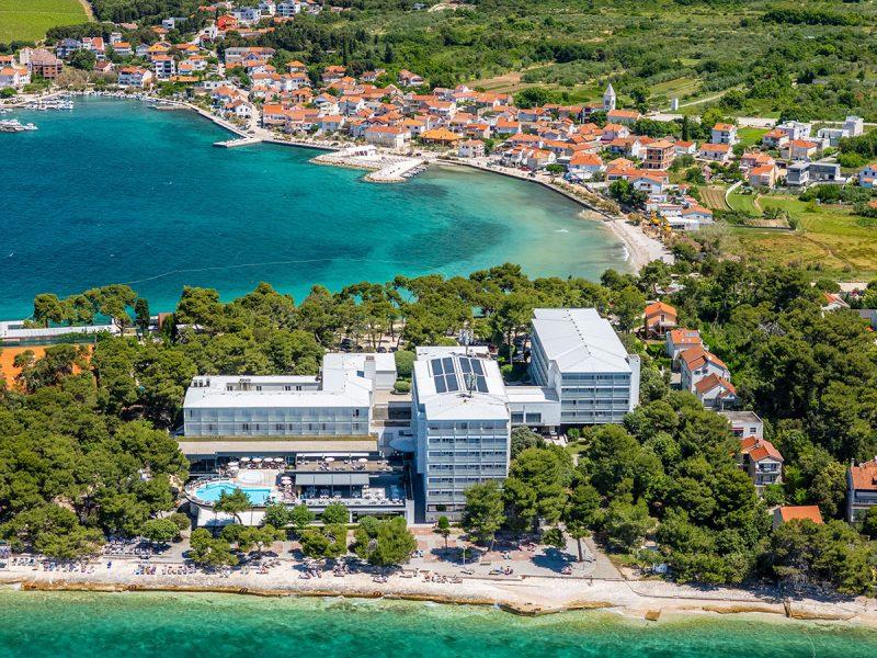 Hotelska ponuda: tri krila međusobno povezana recepcijom (0-24h), klimatiziranim prostranim lobijem, restoranom i lobi barom. Lift, terasa s cocktail barom pored bazena, mini market, suvenirnica, punionica za električna vozila. Unutarnji i vanjski  grijani bazen s hidromasažama i dječji grijani bazen (slatka voda), NOVO OD 2025: ulaz u saune u kompleksu unutarnjeg bazena – uključeno u cijenu (renovirane i novo izgrađene dodatne saune – finska, infracrvena i obiteljska sauna);  na plaži: lounge bar, 3 a la carte restorana, pizzeria, dalmatinska konoba, dječja igrališta, wi-fi (besplatno), animacijski programi, parkiralište (besplatno), kućni ljubimci nisu dopušteni.