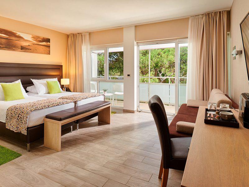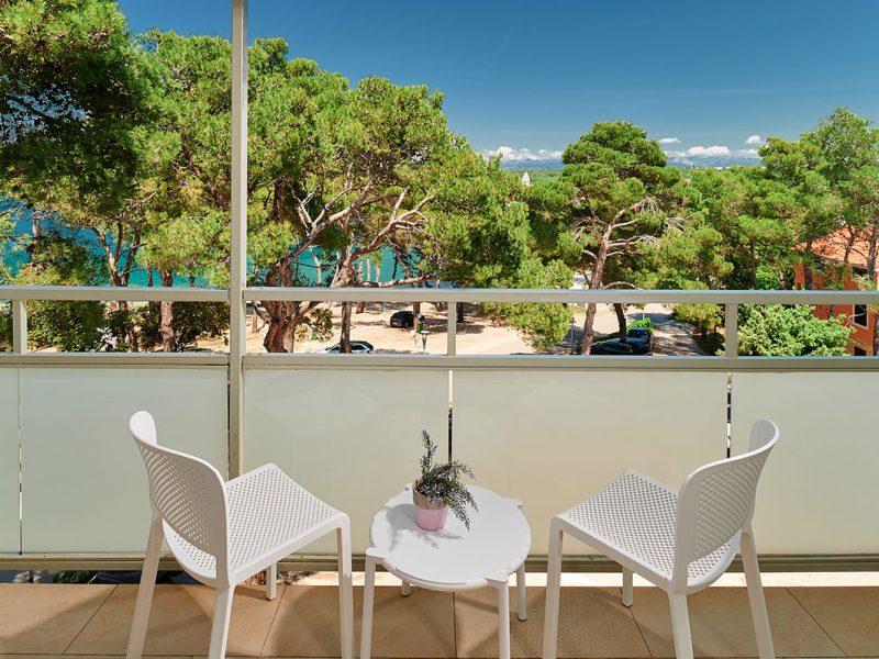 Premium dvokrevetna soba balkon pogled more  (22 m²) – pomoćni ležaj fotelja (90 x190), tuš/WC, sušilo za kosu, telefon, sef, LCD SAT TV, klima uređaj, hladnjak / mini bar (na upit uz doplatu), balkon s pogledom na more.