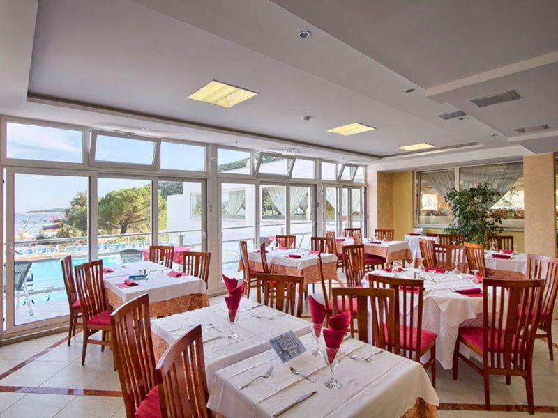 *doručak od 7 do 10 sati: bezalkoholna pića iz šankomata uključena u cijenu (samoposluga), kava vrhunske kvalitete (samoposluga), raznovrsne buffet postaje: kutak s lokalnim narescima, pekara, kutak zdrave hrane, kutak za kavu, jela od jaja; ručak od 12:00 do 14:00: bezalkoholna pića iz šankomata uključena u cijenu (samoposluga)-pizze, sendviči, juhe, salate, topla predjela, riblja i mesna glavna jela, jela od sezonskog povrća, slastice; večera od 19:00 do 21:00 : pizze, sendviči, juhe, salate, topla predjela, riblja i mesna glavna jela, jela od sezonskog povrća, slastice. Tijekom večere sva pića uz nadoplatu, korištenje vanjskih bazena