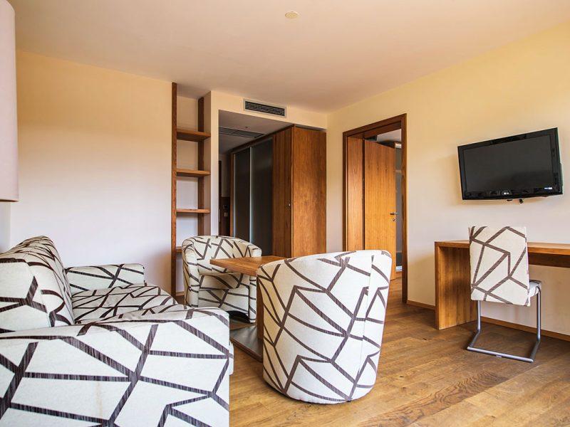 JSU 2-4 junior suit bez balkona, 43 m²; spavaća soba i dnevni boravak, bračni ležaj i kauč na razvlačenje za dvije osobe, kupaonica sa tušem ili kadom, sušilo za kosu, LCD TV, besplatan WiFi, klima uređaj, minibar, sef, telefon, pogled na ljetno kupalište.