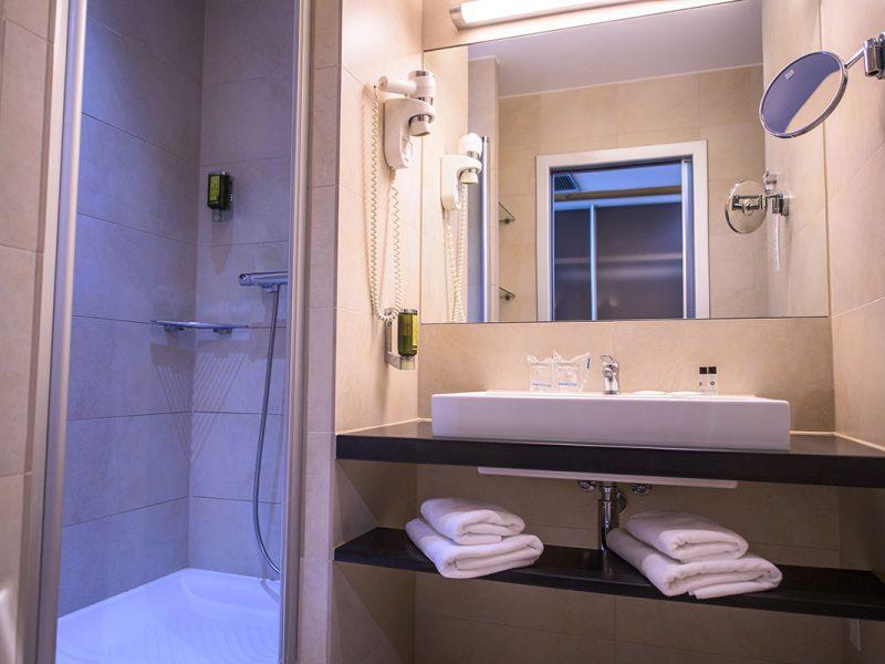 ES-1 B jednokrevetna soba z balkonom, 21 m²; francuski ležaj veličine 140 cm, kupaonica sa tušem – prilagođena za invalide, sušilo za kosu, LCD TV, besplatan WiFi, klima uređaj, minibar, sef, telefon, pogled na parkiralište.