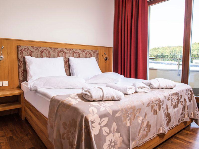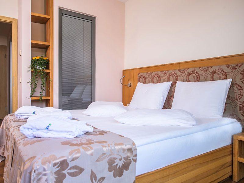 DS2-4 B comfort dvokrevetna soba sa pomoćnim ležajem za dvije osobe i balkonom 34-37 m²; francuski ležaj i kauč na razvlačenje za dvije osobe kupaonica sa tušem ili kadom, sušilo za kosu, LCD TV, besplatan WiFi, klima uređaj, minibar, sef, telefon, pogled na ljetno kupalište.