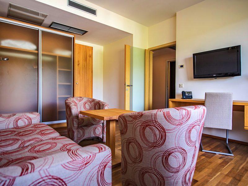 JSU 2-4 junior suite bez balkona, 43 m²; spavaća soba i dnevni boravak, bračni ležaj i kauč na razvlačenje za dvije osobe, kupaonica sa tušem ili kadom, sušilo za kosu, LCD TV, besplatan WiFi, klima uređaj, minibar, sef, telefon, pogled na ljetno kupalište.