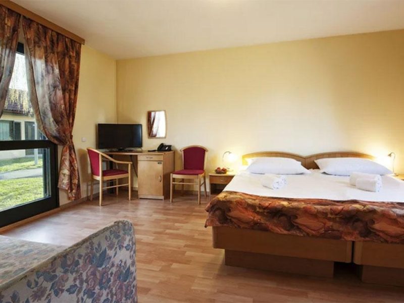 Bungalovi: TV, twc, s ležajem širine 180 cm ili odvojenim ležajevima širine 90 cm i terasom s pogledom na park 1/2 bgw- 23 m2,;1/2+1 – 23 m2,