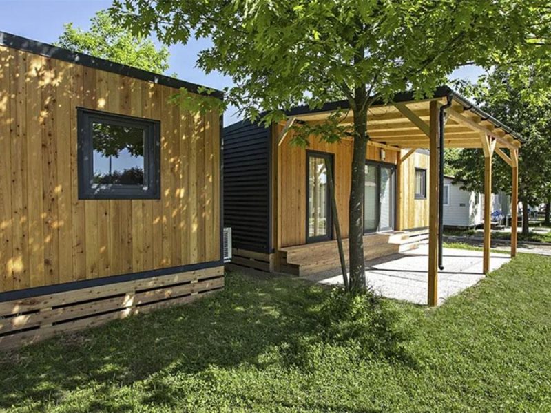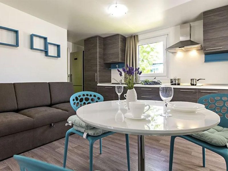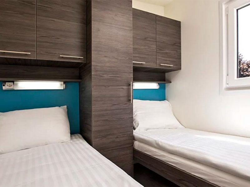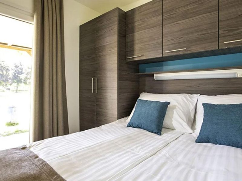Mobilne kućice: 34 m2, za četiri osobe s francuskim ležajem širine 160 cm i odvojenim ležajevima širine 90 cm s pogledom na park